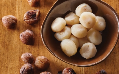 밤에 풍성하게 들어 있는 비타민씨는 콜라겐 생성을 촉진하고 멜라닌 색소가 피부에 침착 되는 것을 막아 주어요. 피부에 잡티나 기미가 없이 깨끗한 피부를 유지 시키는 데 도움을 줄 수 있겠죠. 뿐만 아니라 카로티노이드 폴리페놀등의 항산화 성분이 많이 들어 있기 때문에 노화 속도 저하에 도움이 되고 속껍질에 있는 탄닌 물질이 여드름이나 박테리아와 같은 피부세포 훼손을 먹는데 도움 됩니다.